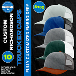 Upgrade your brand with premium embroidered headwear. Our Richardson Brand Snapback Trucker Cap Bundleincludes 10 high-quality trucker hats for $149, featuring full embroidery so you can add any logo or text for a clean, professional look.